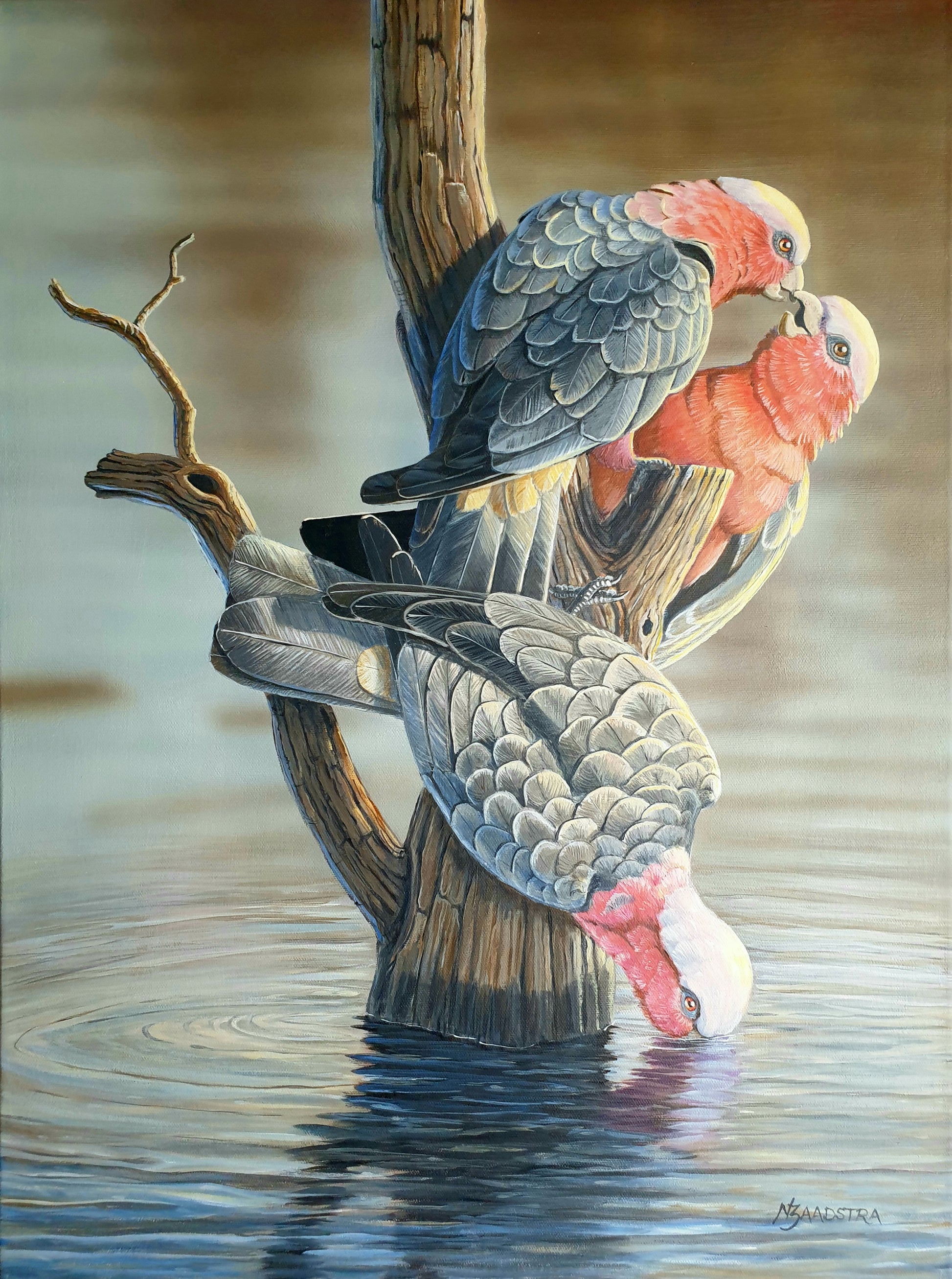 This expertly crafted giclée print titled "A Refreshing Dip Print" captures three galahs drinking delicately from a tree stump. Printed with archival-quality inks on fine art paper, it offers sharp detail and rich, natural colours that preserve the subtle beauty of these Australian birds. Perfect for aficionados of wildlife art, this print brings an authentic and refined touch to any collection or interior setting.