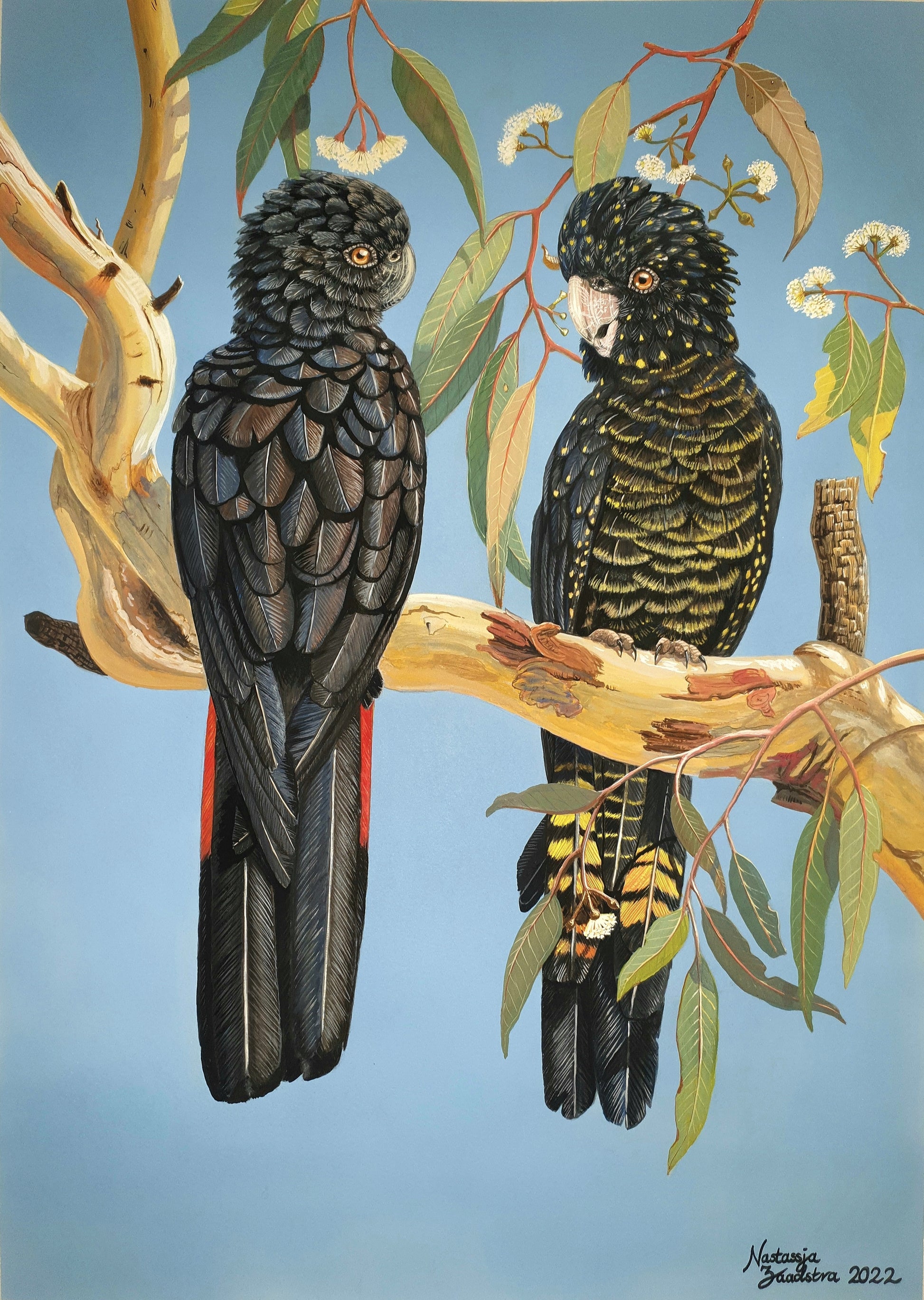 This fine art giclée print titled "Ben and Betty" captures the vivid beauty of two red-tailed black cockatoos perched gracefully in a gumtree. Produced with archival-quality inks on premium paper, this print offers exceptional detail and color fidelity, preserving the intricate textures of the birds and their natural habitat. Ideal for collectors and nature enthusiasts, it brings a refined touch of Australian wildlife into any space.